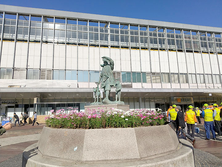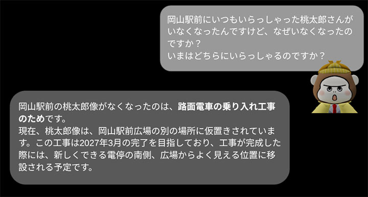 あれ、これまでいつも挨拶してきた岡山駅前の桃太郎さんが、いなくなってる……。