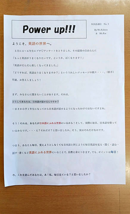 教室に向かうまでの廊下に、英語科通信「Power up!!! By Ms. Kubota & Ms. ケトレゴ」を発見!