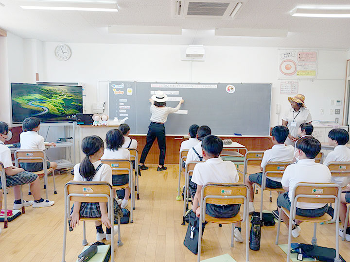 授業では、子どもたちが英語に興味を持てるように、魅力的な掲示物を作成し、ICTツールを活用して、生徒に授業や活動への参加を促しているとのこと。