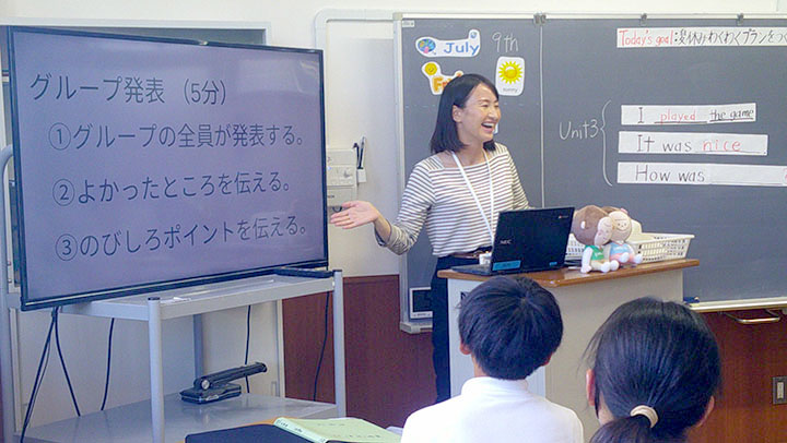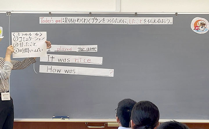 久保田先生が、Today’s goal「夏休みわくわくプランを作るために、今までの経験を伝え合おう。」とクラスのみんなに共有しているよ。