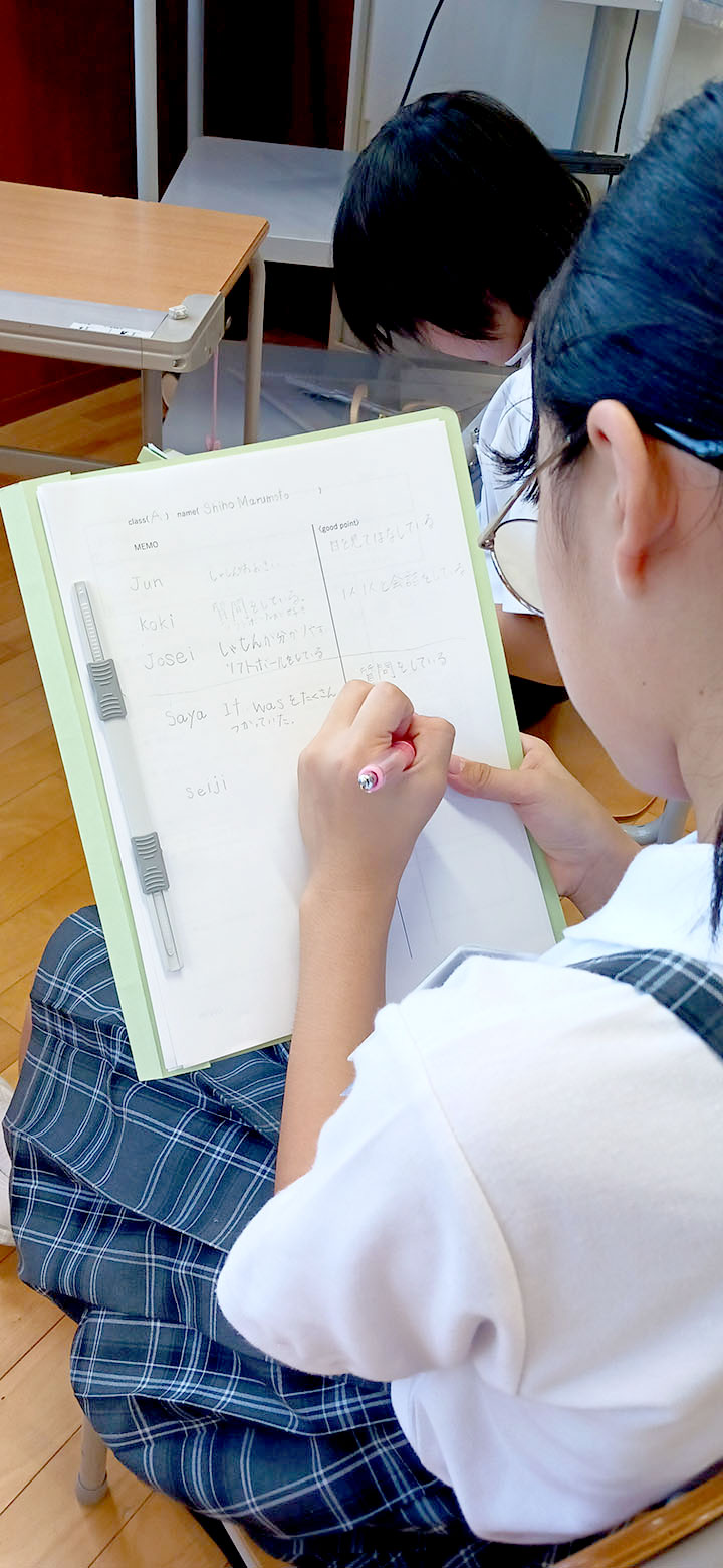 たくさんの単語のメモや、友達のいいところ探しを頑張って書いているね。