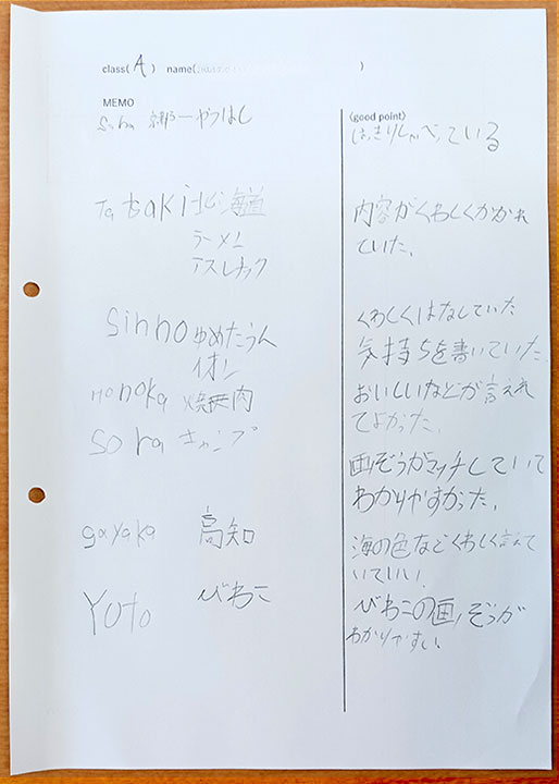 「MEMO」と「good point」が書ける2段組のワークシートでした。