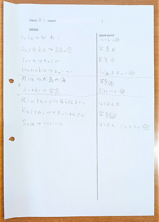 そして、3つのグループ(①「やったことがあること」発表グループ・②「食べたことのあるもの」発表グループ・③「行ったことがある場所」発表グループ)に分かれて、それぞれのグループで発表し合ったよ。