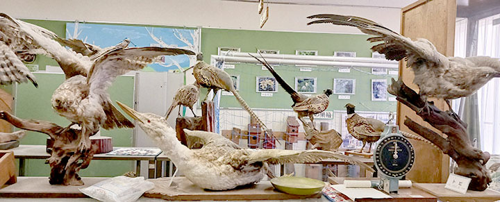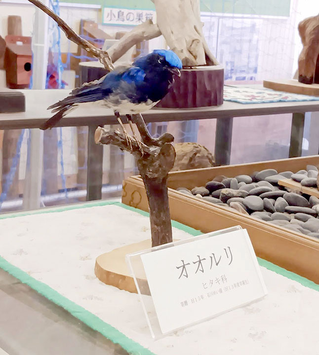 校内をてくてく歩いていくと、たくさんの鳥のはく製が飾られたコーナーが!