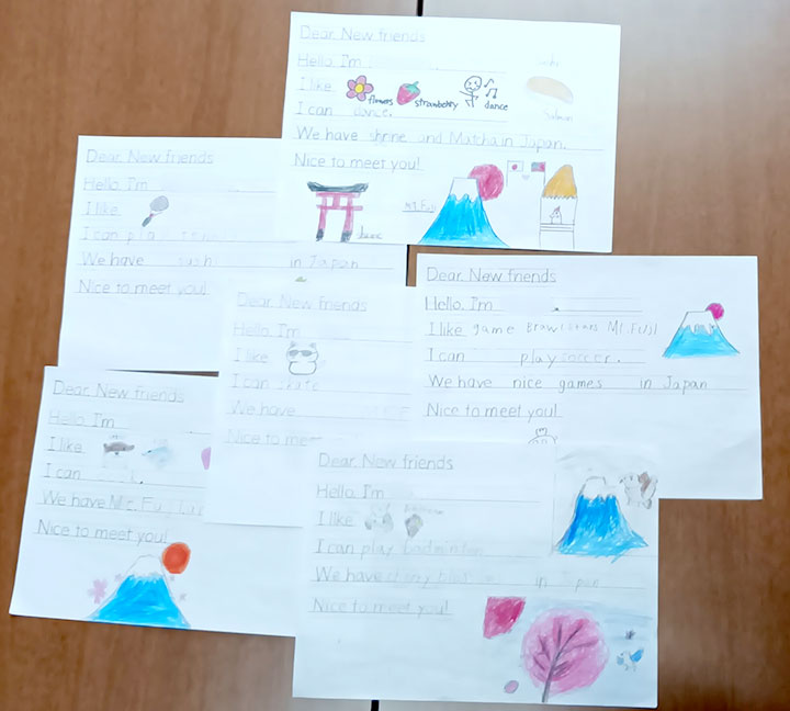 実は、夏に学習した Unit5「Let’s go to the zoo」で、子どもたちは台湾の小学生に手紙を書きました。