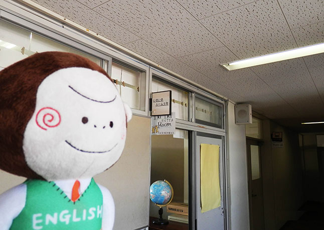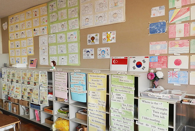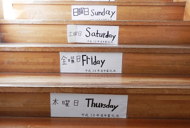 校舎内には,すべての階段や教室の前に手作りの英語表示があります。「曜日」「数」「色」「あいさつ」など,内容は様々です。