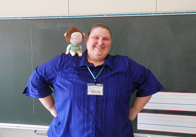 そんな片平先生と協力して授業を行うのは,ALTのレベッカ・パイク先生です。アメリカ・ワシントン州出身で,日本に来て約2年半。日本のアニメと給食が大好きな先生です。