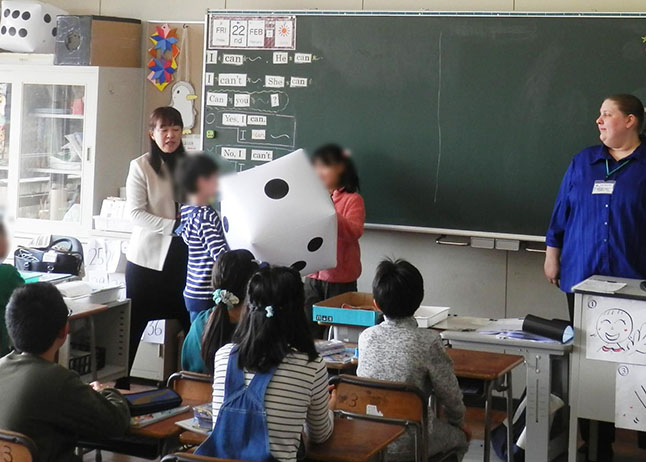 さて,今日は『Let’s Try! 2』Unit 7“What do you want?”を扱います。あいさつをして授業がはじまると,大きなサイコロが登場! 普段からサイコロでウォームアップのテーマを決めているそうです。