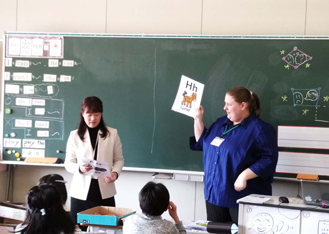 T1の片平恵先生は,4年1組の児童が1年生だった頃の担任の先生です。つくばでの中央研修を受講して宮城県の英語教育推進リーダーになり,現在は県内の研修講師も努めています。