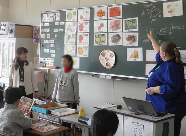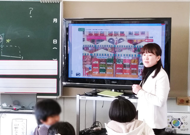 ALTのレベッカ先生も,絵カードやデジタル教材を巧みに操りながら授業を進めます。