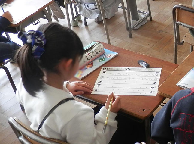 最後に,ワークシートを使って「書く」練習を行いました。まだアルファベットを書くことはしませんが,その準備段階として,曲線や直線を書く練習を行います。