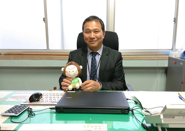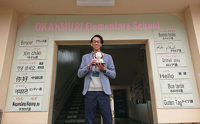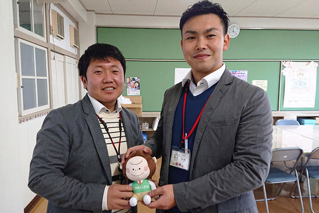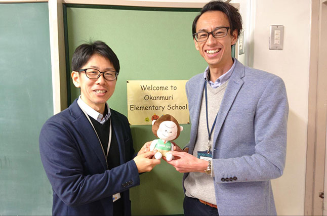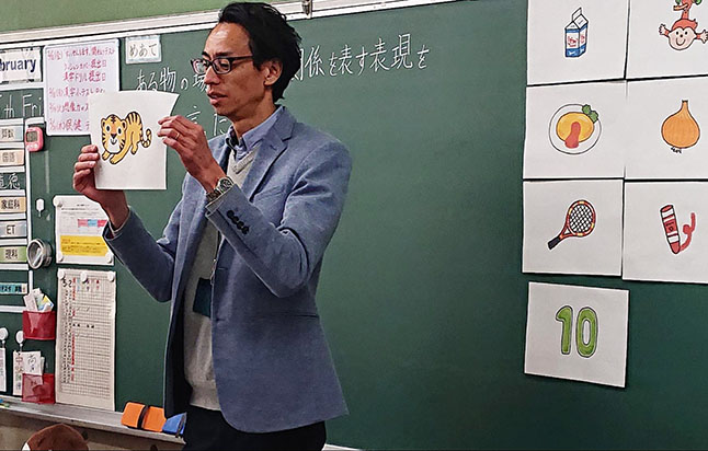 校内に入ると,研究主任の平山欣生先生が玄関で迎えてくださいました。平山先生は英語専科として週20時間以上の授業に立ち,外国語活動・外国語科の取組みを推進しています。また,近隣の小学校で授業したり,市内の先生方と交流したりと,幅広く活躍する先生です。
