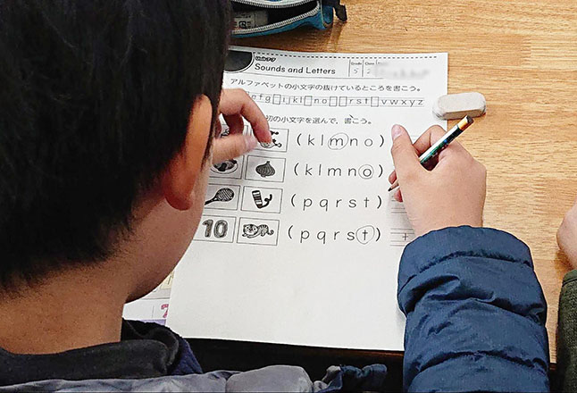 なお,この単元では,活字体の文字を認識し,文字には音があることの理解も深めていきます。Sounds and Lettersの活動では,ワークシートの2つのイラストに共通する初めの音の文字を,音声を聞いて記入します。