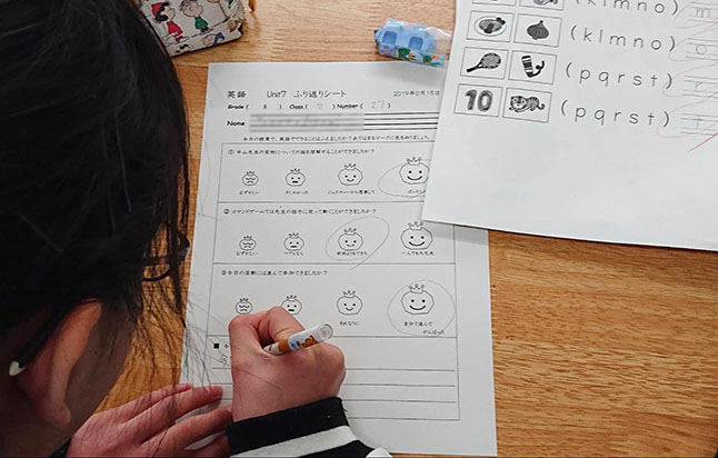 最後に,「ふり返りシート」に自己評価や感想を記入します。児童は思い思いに,学校のマスコット「おおかんくん」にマルをつけたり,色を塗ったりしていきます。大冠小学校では「ふり返りシート」に毎時間取り組んでいて,行動観察でみきれなかった部分や,授業者の見取りとのギャップを確認したり,次時のプランづくりに役立てたりしているそうです。