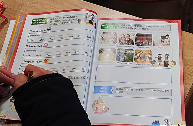 映像を視聴後,石上先生は自らの発音で,『We Can!』の誌面にある様々なクラブ活動を紹介しました。その後,児童にこう尋ねました。「六中はどうやろう?」