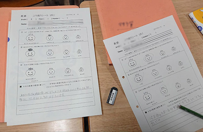 ちなみに,授業後に提出したシートは,先生が確認した後,児童に返され,各自専用の紙ファイルに綴じて保管します。いわゆるポートフォリオにもなっているのですね。