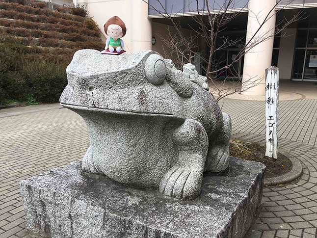 校内を進んでいくと,児童昇降口に大きなカエルの石像を発見!