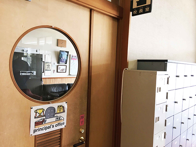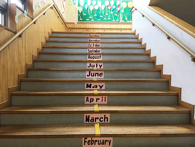 校内には,様々な場所に英語の掲示物が貼られています。階段に月の英語表記を掲示したり,校長室や職員室等の部屋名を英語で記載したりするなど,基礎技能の定着を図る工夫をしています。