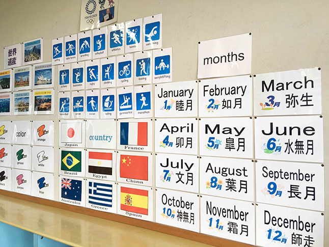教室には,オリンピックの競技や国旗,色,月についての掲示物が掲載されています。