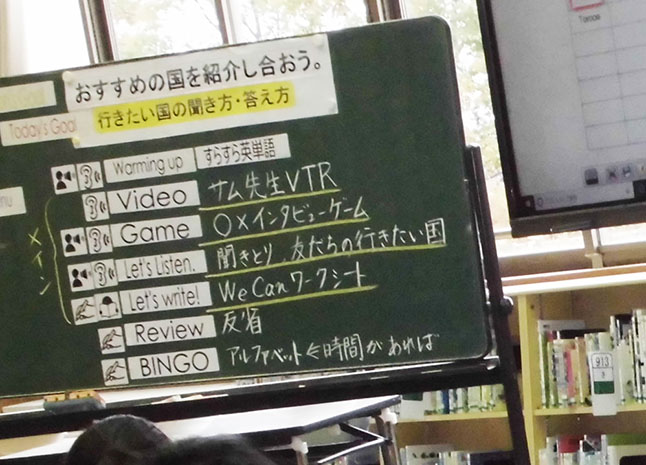 さて,今日は『We Can! 1』Unit 6 I want to go to Italy.の授業を行います。『Hi friends! 2』Lesson 5 Let’s go to Italy.と組み合わせて,単元計画を組んでいるとのこと。授業はほぼ毎時間,あいさつ,ウォーミングアップ,New Words,Listen,Activity,振り返り,ビンゴという決まった流れで,児童もスムーズに動けています。