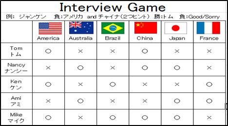 続いて「◯✕インタビューゲーム」を行います。先生は下のようなカードを1人1枚ずつ配ります。カードにはTom,Nancy,Ken,Ami,Mikeの5人の登場人物と,その登場人物が行きたい国が示されています。