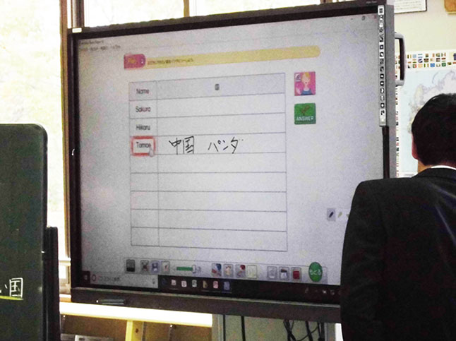 先生はデジタル教材を止めたり,ヒントを出したりしながら,児童の聞き取りをサポートします。