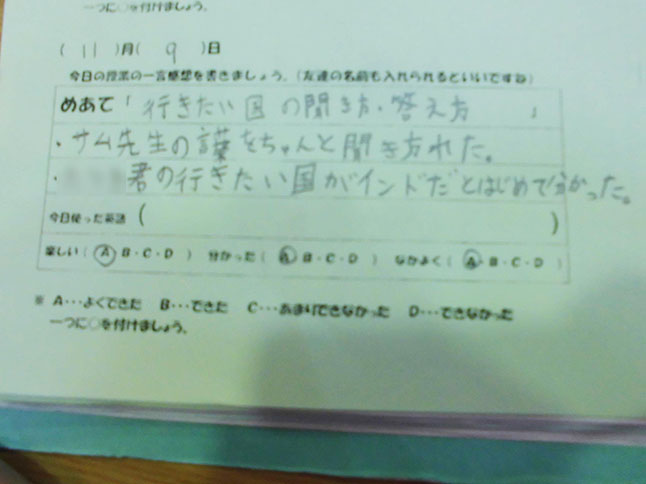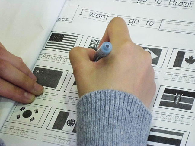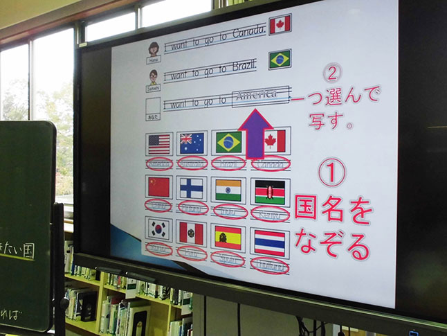 今日の学習で習った国名をなぞり,その後で自分が行ってみたい国を書き写していきます。