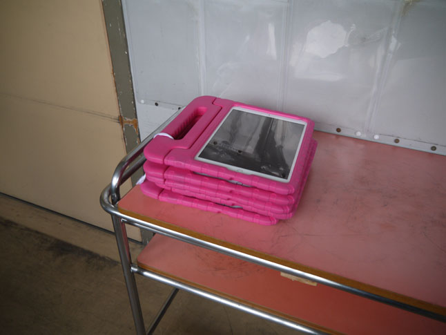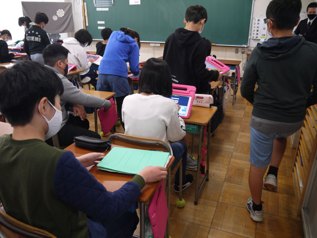 さて,児童が次々と取っていくものが教室の外に…何だろう,これはもしかして,噂のデジタル端末?