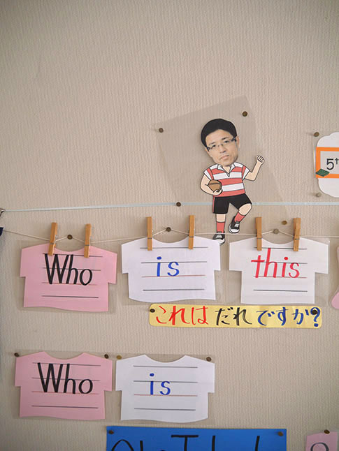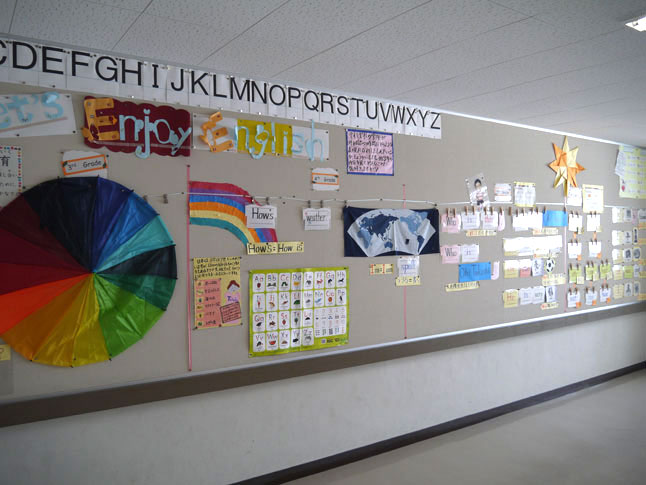 インタビューのあとには,英語を使ったとっておきの場所にも案内してくれました。Thank you! ここでは,授業で黒板の実際に使った素材を掲示するなどしており,神田先生は「このようにすると,手間もかかりませんし,『文字の色が違うのはどうして?』と興味をもち,聞いてくる児童もいます!」とアドバイスも。