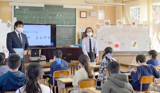 今日の授業は学級担任の中野浩太郎先生(写真左)と,英語指導員のEthan先生(磯部文雄先生,写真右)のTTで行われます。実はわたくし,Ethan先生とは2年前にお会いしたことがあるのです。Long time no see,Ethan先生, お元気そうで何よりです!