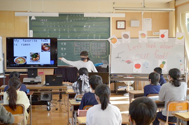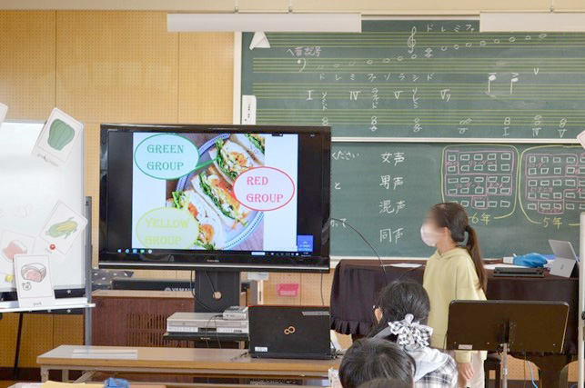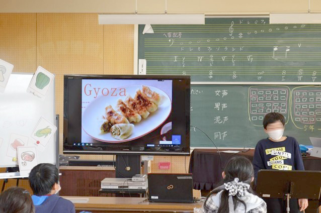 早速,児童たちのプレゼンテーションが始まりました。ラーメン,ピザ,寿司,牛丼などなど,好きな食べ物を次々と発表していきます。Enjoy Communicationの例文やヒントを参考に,食材の産地や栄養素のグループについても説明してくれました。