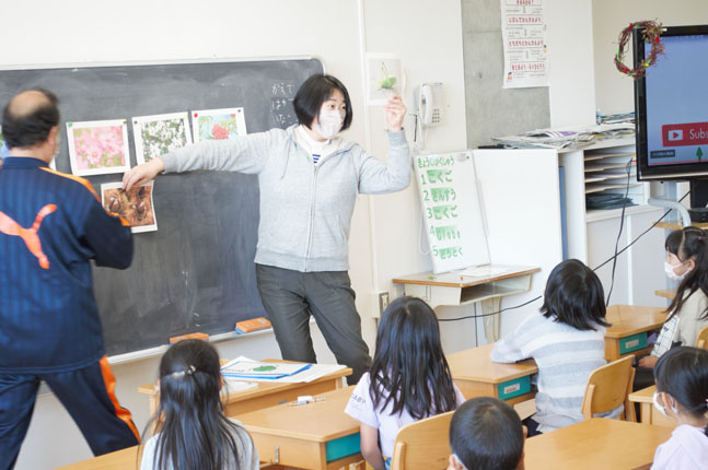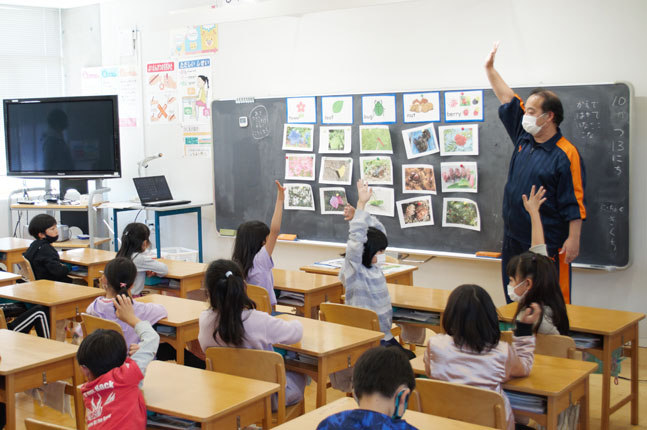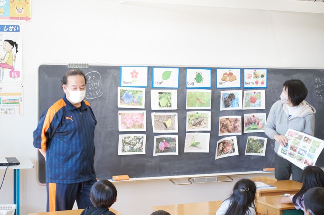 今日は、その「Globe」の授業の中から「みつけた はると なつを えいごで いってみよう」の授業を見せていただきます。