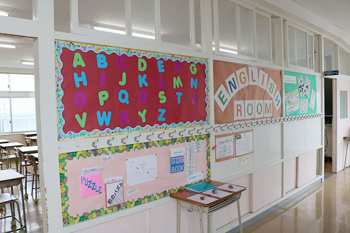 英語の授業を受けるときは、こちらの教室に移動します。先生方が手作りをしたパズルなどの教材があり、子どもたちが主体的に取り組めるように工夫されています。