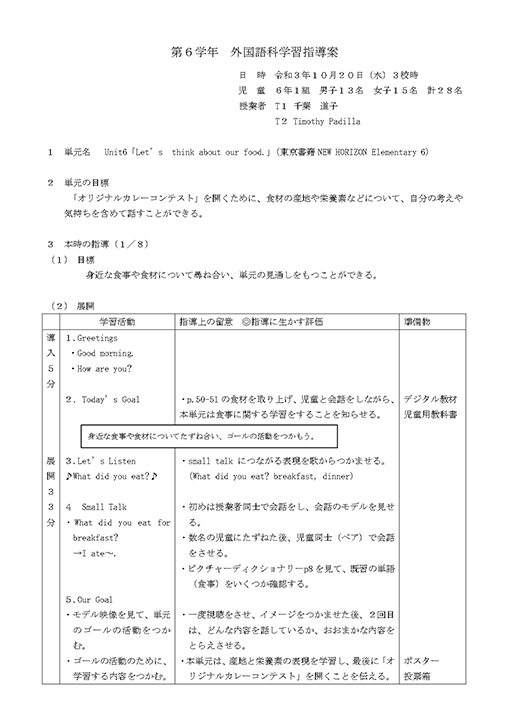 さて、取材させていただくのは、元気いっぱいの6年1組です。担当は千葉道子先生とALTのティモシー・パディラ先生です。