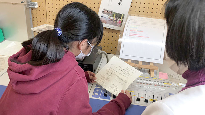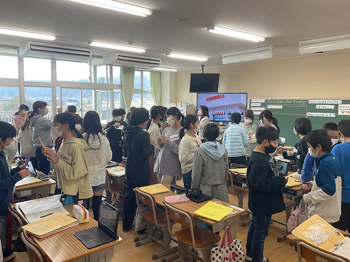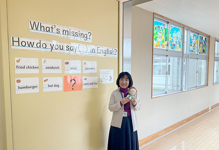高学年の児童が、給食時間の校内放送で、その日の給食で使われている食材を英語で紹介しています。ここで、廊下に掲示されていた「Missing Game」の答えも放送されます。