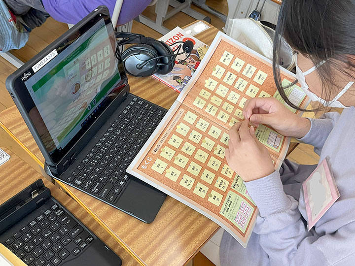 PC画面の文字とワークシートの文字が同じであるかどうかを確認することで、読む活動にも繋がっているね。