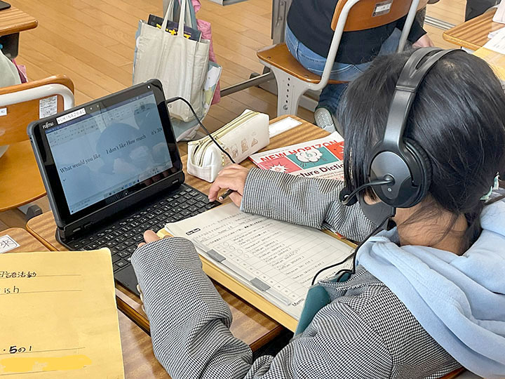 また、ICTと英語は親和性が高いと感じられており、マイクとヘッドフォンが一体となったヘッドセット約70台が導入されました。