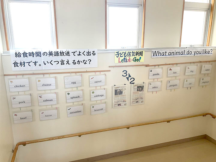 教室の入り口や廊下などにいろいろなピクチャーカードが貼られています。普段から英語に触れることができるね。