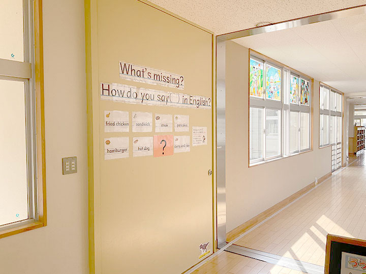 How do you say ( )in English? 〔( )を英語で何というでしょう?〕という英語が貼られており、隠された1枚の答えは、給食時間の放送で発表されます。