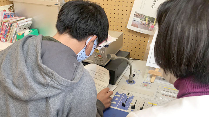 先生の前で発話するときは、スパニッシュカスタネットの音に合わせて声を出しているよ。