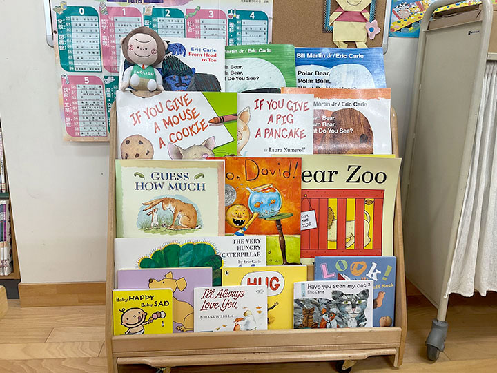 図書室には、英語の大型絵本がありました。岩永先生やALTの先生が授業中に読んでくれるみたい。児童が、絵本を借りて「読んでほしい」と授業の始めに持ってくることも…。