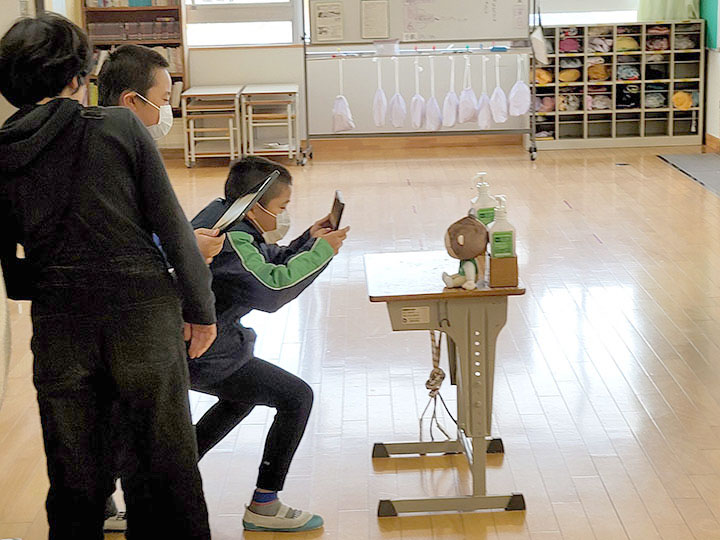 次に、2021年度から導入された1人1台のタブレット端末を使って、『Picuture Dictionary』の二次元コードを読み込み、発音の自主練習を行います。個別の端末を使うことで、自分に合ったペースで練習をすることができていました。