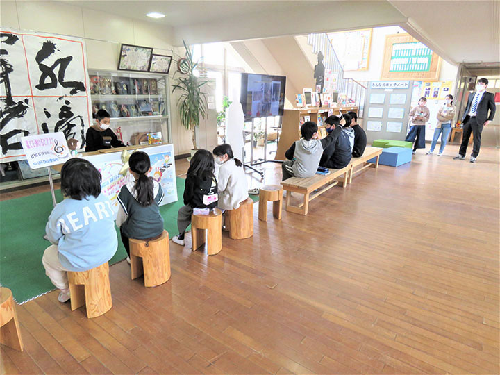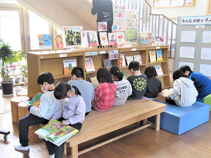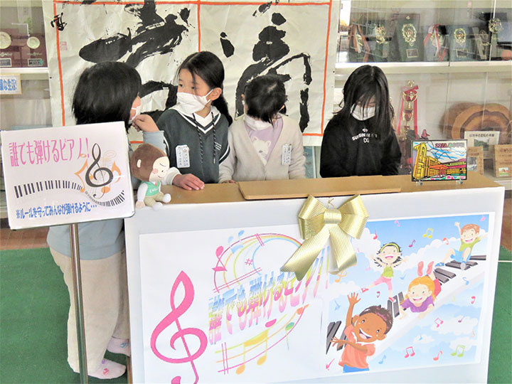 休み時間には、多くの児童と先生方によるピアノの美しい音色で賑わっていたよ。また、読書コーナーでも学年間の交流が生まれているね。