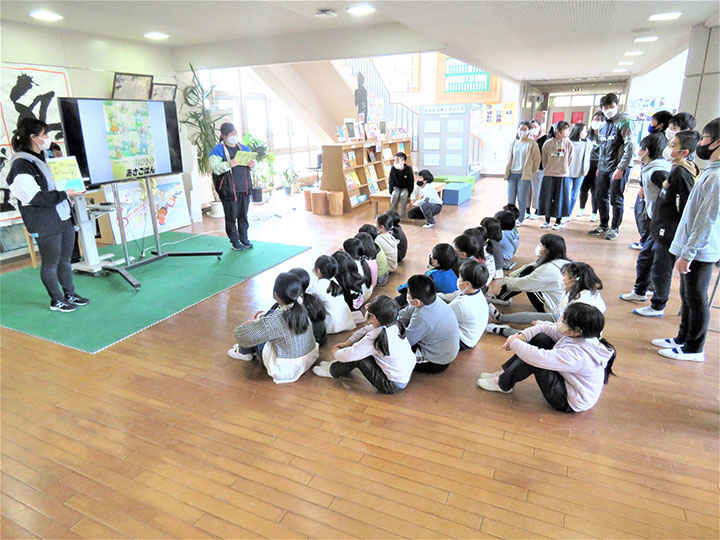 聞き手のみんなは笑顔やアイコンタクトのエンカレッジメントで盛り上げます。社会科や家庭科と連携した紹介も見られました。