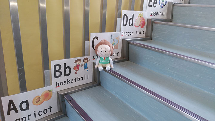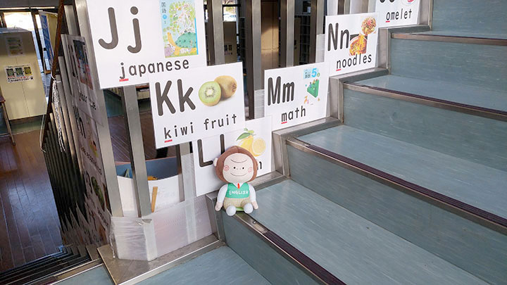 校内には、たくさんの英語の掲示物が廊下や階段、教室などに貼られているよ。授業の始めに実施しているアルファベットジングル(発音練習)用の教材をアルファベットごとにカードで表示をするなどして、常に子どもたちの目に英語が触れられる状態を生み出しているそうです。