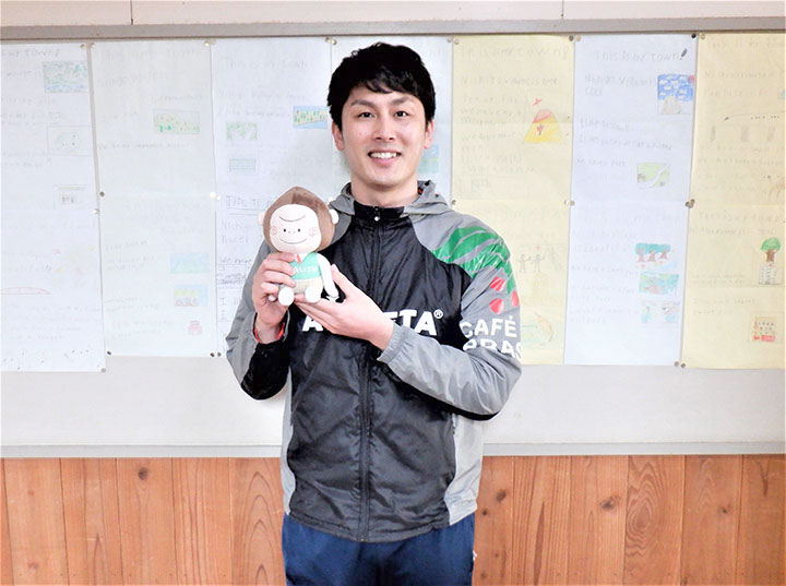 担任の松本和也先生です。特技はサッカー。モットーは「何事にもチャレンジ!」。「英語教育を通して、子どもたちのコミュニケーション能力を高めていきたい」という熱い思いをもっているよ。