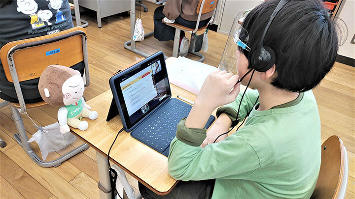 今、英語教育で求められている「使える英語」「話す力」「表現力」「コミュニケーション能力」の育成を目指して、授業以外の時間に1回25分のレッスンを年間34回実施しています。みんな、外国人講師と積極的にコミュニケーションをとりながら、活き活きと学習していたよ。「外国語活動」「外国語科」の学習で「英語力」を培い、オンライン英会話レッスンで「英語を話せる子どもの育成」を図るべく、教科との両輪で英語の教育を進めています。