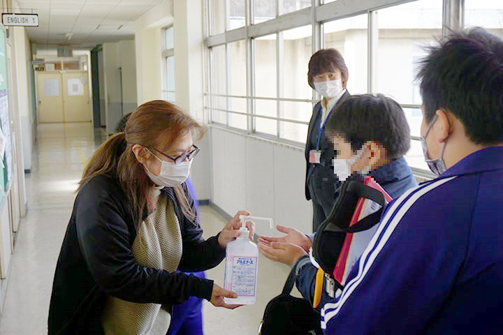 ALTのGemma(ジェーマ)先生が消毒液で子どもたちをお出迎え。