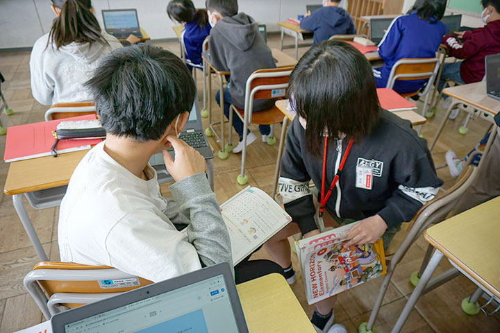 こちらは紙の教科書をみんなで使って、表現を考えているみたいですね。
