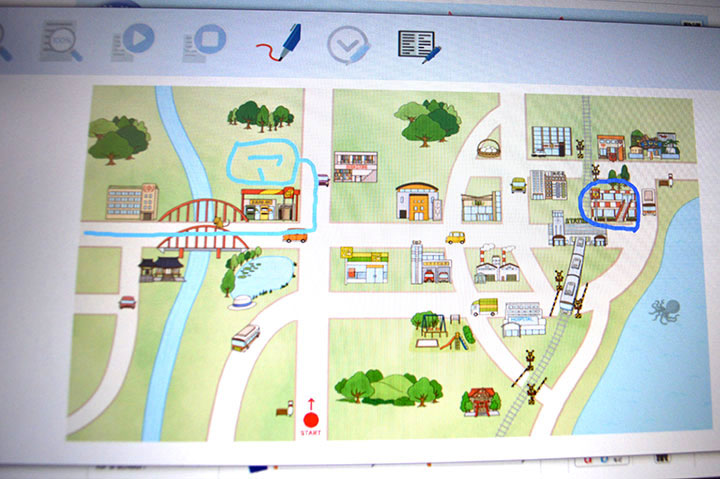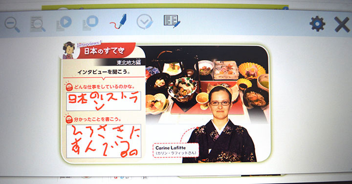「5年生のUnit5『Where is the post office?』で使いました。書き込んだものをすぐに消して修正できる点はデジタルならではだと思います。これまでは紙に書かせていたのですが、消すと汚くなるのが難点でした。」